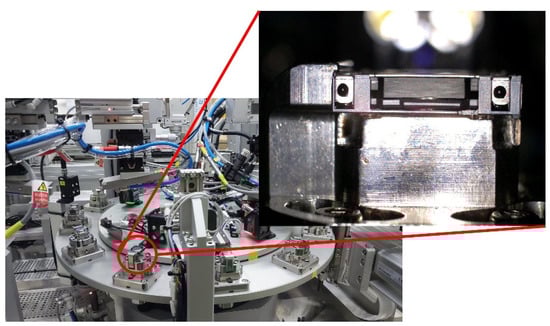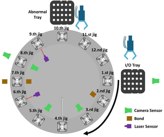 Figure 8a illustrates the conventional inspection method, in which a worker visually inspects each module through a microscope. Figure 8b shows a close-up photograph of a camera equipped with an integrated flash capturing an OIS actuator mounted in the jig. Figure 8c presents the automated defect classification device, which consists of 12 jigs, five fixed cameras, two laser sensors, input/output trays, and a separate reject tray. The device operates as follows: a robotic arm picks one of the 20 OIS actuator modules placed in a 5 × 4 tray, captures an image with the first camera, and then places the module into the first jig. The jigs are mounted on a rotating platform and pass through 12 stages, including adhesive dispensing, filter attachment, imaging, orientation adjustment, and gap inspection. At the eighth jig position, images of both the hook1 and hook2 surfaces are captured simultaneously and are directly used for gap-based defect classification. At the ninth jig, a laser sensor checks the orientation of the module, and at the tenth jig, modules are sorted based on the final defect classification result: a module classified as normal is rotated back to the starting point and placed onto the input/output tray, whereas a defective one is transferred to the reject tray at the tenth jig. The entire cycle takes approximately one minute. Figure 9 presents the full schematic of the automated defect classification device. This precise and fully automated setup enables the consistent collection of high-quality data, supporting the development of a reliable and practical defect classification algorithm under real manufacturing conditions.
