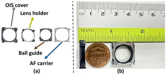 Comparison image of OIS actuator components and dimensions: (a) Details for each components; (b) Size reference of OIS actuator.