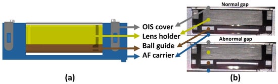 Diagram and collected comparison images of normal and defective hook2 surface of OIS actuator: (a) Structural layout of the OIS actuator; (b) Comparison of gap conditions in the OIS actuator.
