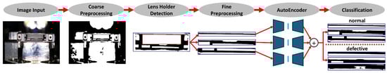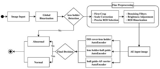 This study proposes a real-time unsupervised defect classification algorithm that combines a customized image preprocessing algorithm and an AE, designed to meet key constraints such as noise robustness, real-time performance, and scalability. The overall workflow of the proposed algorithm is illustrated in Figure 4 and Figure 5. First, the input image is binarized to detect the lens holder, and three ROIs corresponding to the target gaps are defined. For each ROI, noise reduction preprocessing (such as filtering and brightness normalization) is applied to generate the final preprocessed images, which are used as inputs to the AE. If lens holder detection fails, the image is immediately classified as defective. If detection succeeds, the three preprocessed ROI images are individually fed into their respective AEs, and a final defect classification is made based on thresholded reconstruction errors. Accordingly, the first stage (image preprocessing) and the second stage (unsupervised defect detection) together enable improvements in processing speed and classification accuracy, as well as enhanced model scalability.