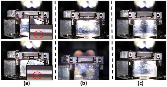 In the defect classification of OIS actuators, issues such as noise, lighting imbalance, and component position deviations significantly reduce the accuracy of gap-based classification. Therefore, a dedicated preprocessing algorithm is essential to address these challenges. This section explains the necessity of preprocessing for each issue type, accompanied by illustrative examples. Figure 6a demonstrates how noise distorts the gap boundary. The figure compares the differences in detecting the gap between the ball guide and the AF carrier depending on the presence or absence of noise. In the top image, the enlarged area beneath the ball guide clearly shows a clean, dark gap, while in the bottom image, the same area is partially obscured by a white smudge, distorting the gap appearance. Even such minor noise can be critical, as the gap appears only about 2 to 9 pixels wide in the original image (1280 × 960). Figure 6b compares brightness levels caused by installation environment differences. The top and bottom images were captured using two identically manufactured defect inspection devices, but due to differences in their installation environments, the brightness of the collected images varies. Therefore, brightness adjustment preprocessing is necessary to address lighting imbalance. Figure 6c compares well-seated and misaligned OIS actuators. Most of the time, the device is properly seated in the jig during operation, as shown in the top image; however, there are occasional cases where it is not properly seated, as illustrated in the bottom image. Even in cases where the OIS actuator is not severely misaligned, as shown in the image below, slight misalignment that is difficult to detect with the naked eye can significantly affect the placement of the ROI for the gap, which is only about 2 to 9 pixels wide within the component. To address this, dynamic ROI adjustment is necessary. Figure 6 visually demonstrates the effects of noise, lighting imbalance, and positional instability in actual images, supporting the necessity of the proposed step-by-step image preprocessing algorithm.