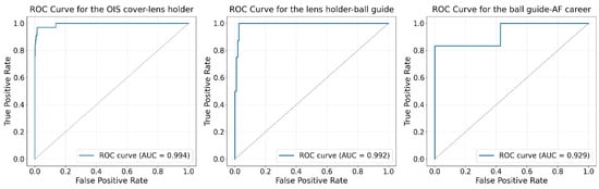 The final images produced through the proposed preprocessing algorithm effectively address key constraints in the manufacturing process, such as noise, lighting imbalance, and positional deviation. To perform precise defect classification under such environmental variability, it is necessary to minimize labeling costs. In addition, an unsupervised learning-based AE is suitable, as it can sensitively respond to structural anomalies in the gap regions. To quantitatively validate this, Figure 7 presents the Receiver Operating Characteristic (ROC) curves and the Area Under the Curve (AUC) values obtained through exploratory analysis using AEs on the three final preprocessed images. In the ROC curves, the vertical axis represents the True Positive Rate (TPR), and the horizontal axis represents the False Positive Rate (FPR). TPR indicates the proportion of actual defective samples correctly identified as defective, while FPR denotes the proportion of normal samples incorrectly classified as defective. As shown in Figure 7, the ROC curves are skewed toward the upper-left corner, above the baseline of a random classifier (y = x), indicating that high TPR and low FPR were achieved simultaneously. In fact, all AEs achieved AUC values above 0.9, demonstrating that even reconstruction errors alone from the proposed preprocessed images can reliably distinguish between normal and defective samples. These results experimentally validate that the unsupervised AE-based approach is well-suited for detecting structural anomalies in gap regions within this manufacturing process.