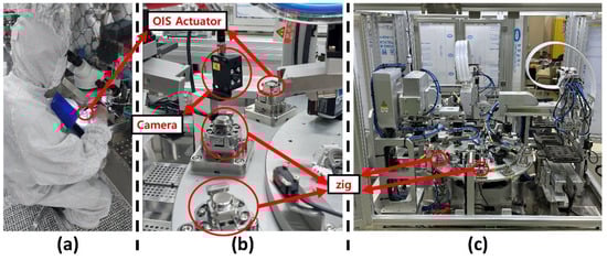 Comparison of manual and automated defect classification systems for OIS actuators in a smart factory environment: (a) Cleanroom inspection; (b) Camera–jig close-up; (c) Inspection overview.