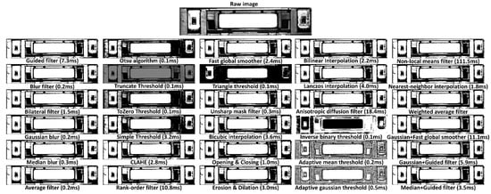 In this study, a preprocessing algorithm combining a median filter and a guided filter was adopted to maximize the accuracy of AE-based defect classification model. This combination demonstrated the most effective noise reduction performance among various tested techniques while maintaining real-time processing capability. Specifically, after defining ROIs and applying 4× magnification to the cropped gap areas, the combined filtering approach effectively removed both magnification-induced noise and noise originating from the imaging environment. Complex deep learning-based denoising methods were excluded due to real-time processing constraints, and the focus was placed on lightweight, filter-based algorithms. A total of 30 preprocessing methods were compared, including thresholding, basic filtering, morphological operations, interpolation techniques, average filters, weighted average filters, and rank-order. These methods were tested both individually and in various combinations. The combined filtering methods selected for evaluation were those that outperformed single methods without compromising real-time performance. Figure 10 presents a comparison of the results obtained by applying all 30 algorithms to the same cropped image. The evaluation was conducted visually by both component experts and computer vision specialists, confirming that the median + guided filter combination yielded the best results. While this comparison was based on images cropped to include the entire component, in actual deployment, the chosen preprocessing combination is applied individually to each of the three gap ROIs before being used as input for the AE model. In conclusion, the adoption of this optimal preprocessing algorithm (balancing real-time performance and denoising precision) provides a strong foundation for maximizing the effectiveness of the unsupervised AE-based model.