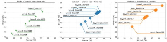 For each of the three gap positions, an optimized AE model architecture was designed, and their individual predictions were integrated using an AND operation to complete the final defect classification algorithm. The final evaluation results showed an accuracy of 98.03% (5566/5678) for normal samples and 100% (50/50) for defective samples, resulting in an overall accuracy of 98.04% (5616/5728), demonstrating strong performance. To determine the optimal AE model structure for defect classification using the preprocessed images (processed through noise reduction and dynamic ROI assignment) a series of experiments were conducted. The number of AE layers was varied (2, 3, and 4 layers), the latent space dimensions were set to 32, 64, and 128, and the input image sizes were tested at 64 × 64, 128 × 128, and 256 × 256. Approximately 5000 images were split into training and test datasets with an 8:2 ratio. Model performance was evaluated using accuracy on normal images, accuracy on defective images, and overall accuracy. The test dataset included 1137 normal and 33 defective images. Table 3 presents the defect classification performance of the AE model for the OIS cover–lens holder gap, including layer depth, latent space size, input image dimensions, AUC-derived threshold values, and average inference time per image. Among all configurations, the structure with an input size of 128 × 128, four layers, and a latent space of 64 yielded the highest overall accuracy of 98.46%. However, one of the key requirements from the partner company is to prioritize the accuracy of defective sample detection. Therefore, a model configuration with an input image size of 256 × 256, two layers, and a latent space dimension of 128 was adopted. Although another configuration with 256 × 256 input, two layers, and a latent space of 64 detected all but one defective image, its lower normal accuracy made it unsuitable. The overall results in Table 3 show that larger input sizes, deeper layers, or larger latent spaces do not necessarily guarantee better performance. Table 3 reports the Wilson 95% confidence intervals for the normal accuracy of each configuration (e.g., 1120/1137 = 98.50%, 95% CI [97.62, 99.06]). Because the normal class has a sufficiently large sample size (n = 1137), the interval width is very narrow, indicating stable estimates and allowing interpretation of differences at the first decimal place. The Wilson interval is computed using the sample size n, the critical value z corresponding to the desired confidence level, and the number of successes x. The formulas for the interval are provided in Equations (1) and (2). Therefore, similar experiments were conducted for the other two gaps (lens holder–ball guide and ball guide–AF carrier) to identify their respective optimal AE architectures. For the lens holder–ball guide gap, the selected model achieved 98.42% accuracy for normal samples (1123/1141), 83.33% for defective samples (5/6), and 98.34% overall accuracy. The selected configuration was: input size 128 × 128, four layers, and latent space of 32. For the ball guide–AF carrier gap, the model achieved 99.91% accuracy for normal samples (1141/1142), 75.00% for defective samples (3/4), and 99.83% overall accuracy. In conclusion, optimal AE-based defect classification models were designed for all three gaps (OIS cover–lens holder, lens holder–ball guide, and ball guide–AF carrier) and their predictions were integrated using an AND operation for the final classification. This approach quantitatively demonstrates its robustness against environmental noise and positional uncertainty, achieving high reliability in defect detection under real manufacturing conditions. In Table 3, the AE configuration that achieved the highest defective detection performance with 32 out of 33 correct detections exhibited significantly lower accuracy in normal detection, making it unsuitable as an optimal AE structure. The next-best configurations, each achieving 31 out of 33 correct defective detections, amounted to 21 in total. Their performance comparisons, grouped by image size, are visualized in Figure 11 as a scatter plot. The x-axis represents normal detection accuracy, the y-axis denotes average (overall) performance, and the marker size reflects inference time, where smaller markers indicate faster inference. Among all configurations, the model with an image size of 256 × 256, two encoder layers, and a latent dimension of 128 clearly demonstrates the best overall performance.