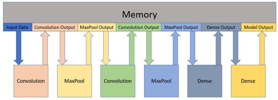 Figure 4 shows the dataflow of the model. So, at the end of each layer, the outputs are stored in the memory and the next layer loads these values to start executing.