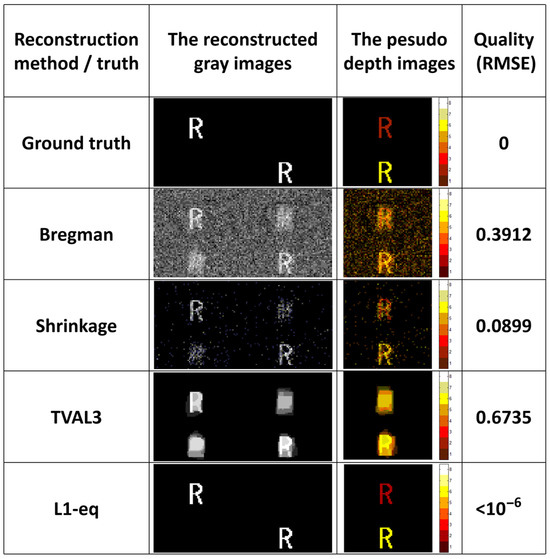 When theoretically extending single-detector three-dimensional synchronized compressed sensing in Section 3, the solution approach for compressed sensing in Equation (3) remains useful, requiring only modifications to the shape of the measurement matrix and the target based on our conceptual framework. However, when implementing a practical synchronized compressed optical sensing experimental system using the actual 3D volume structure illumination from Section 4, it introduces a spatially defocused kernel that exhibits correlations with other depth vectors in the measurement matrix. Under similar circumstances, the original compressed sensing reconstruction methods did not account for optical non-overlapping constraints, where targets at different depths cannot overlap. Therefore, classic compressed sensing reconstruction methods such as TVAL3, Bregman, Shrinkage and L1-eq were used for simulation reconstruction experiments without noise to verify their feasibility. We set n = 64, with two targets ‘R’ located at depths of 1500 mm and 3300 mm, respectively, occupying the upper and lower halves of the image plane.
