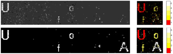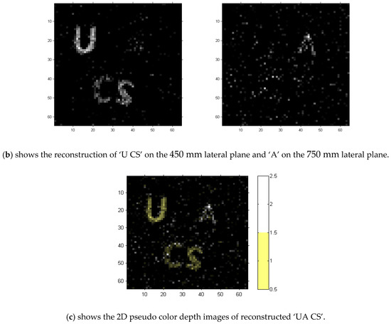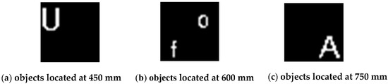 The objects “U”, “of”, and “A” located, respectively, at 450 mm, 600 mm, and 750 mm along the axial axis, shown in the lateral image with 32 × 32 relative resolution, represent the 3D model defined in Section 2. We set a reflective ratio equal to 1 as white and a transparent ratio equal to 0 as black, as shown in the binary images.