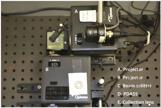 The hardware experimental setup photograph is illustrated in Figure 11. Projectors A and B were positioned on the same horizontal plane with their optical axes perpendicular to each other, converging through beam splitter C, yet projecting at varying focal distances to create a multi-depth volume illumination. The projection matrices within both projector A and projector B were random 64 × 64 black-and-white matrices. D was a single-pixel detector, which was fitted with lens E for the collection of reflected light energy. The data from sensor D was captured through a data acquisition board and processed using a low-pass filter. The collection optics E parameters were D = 11.5 mm and EFL = 17.5 mm, coated with MgF2. The projectors we selected were portable DLP LED projectors using a white light source, which featured a 0.45-inch diagonal DMD with a 7.6 µm micromirror pitch. For the sensor, we utilized the PDA55 and acquired its data using an NI-DAQ device.