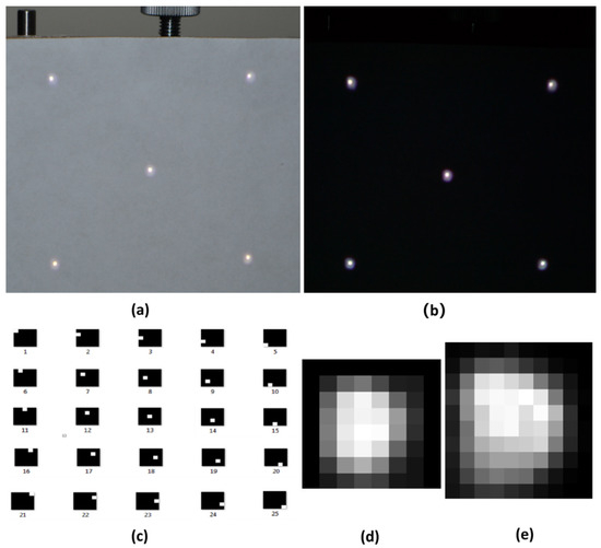 (a) is a photograph of the light adjustment, showing the projection pattern with a reflective plane. (b) depicts the image captured in a dark room. (d,e) show the defocus patterns used to replace the defocus PSF located at 750 mm and 450 mm, respectively. (c) shows the 25 patterns used to perform the scan calibration.