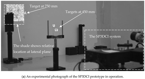 The image (a) depicts an experimental photograph of our SP3DCI prototype in operation. In the distance, the paper-cut letter ‘A’ is positioned, while the paper-cut letters ‘U CS’ are placed closer to the foreground. We deliberately included a whiteboard further back to showcase the projected volume illumination pattern, as well as the spatial relationship between the target ‘A’ and the target ‘U CS’. The image (b,c) represent the reconstructed images of A at 750 mm and U CS at 450 mm at their respective depths, as well as their pseudo-color 2D depth maps.