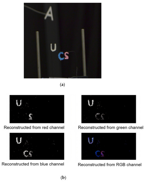 (a) depicts a three-dimensional color experimental scene, where we utilized a pink paper-cut ‘S’ and a blue paper-cut ‘C’, along with a white paper-cut ‘A’ positioned farther away. The letter ‘U’ was placed at the same depth as ‘S’ and ‘C’. (b) illustrates the experiment in which we conducted tests using red, green, and blue light, obtaining the target’s response for each color channel. These responses were then superimposed using RGB to reconstruct the three-dimensional information along with the color target.