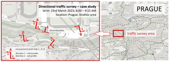 - Hajčiarová, E. Methodology for the Evaluation of Directional Traffic Surveys. Master’s Thesis, CTU in Prague, Faculty of Transportation Sciences, Prague, Czech Republic, 2023. [Google Scholar]