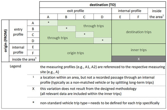 | Route types (through, origin, destination, inner) | Count; ratio. | Throughout the area; in measuring profiles; in measuring sites. | [12,57,68,69] |