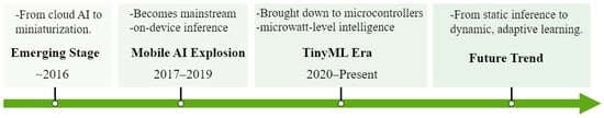 The development of EAI can be divided into three key eras, as illustrated in Figure 1. The core paradigm of the embryonic stage (pre-2016) was the exploration of miniaturization from cloud AI, marked by early compression algorithms such as SqueezeNet. The mobile AI explosion period (2017–2019) saw the maturity of the MobileNet series and TensorFlow Lite (TFLite), which enabled a large-scale shift of AI’s focus from the cloud to the edge, making real-time inference on-device mainstream. The TinyML era (2020-present) has seen the ultimate downscaling of AI capabilities to microcontrollers, driven by technologies such as AI-accelerated microcontrollers and lightweight Transformers, giving rise to always-on, microwatt-level intelligence [10,11]. In the future, EAI is heading towards the next paradigm shift, from static inference to dynamic, adaptive learning [12,13,14].