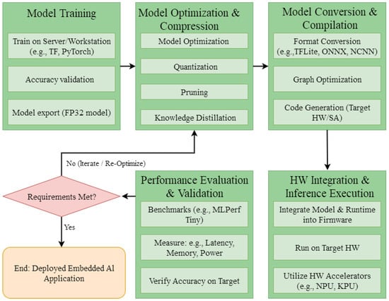 The transformative potential of Artificial Intelligence (AI) is undeniable, with its influence permeating diverse sectors ranging from healthcare and finance to transportation and entertainment [1,2,3]. Traditionally, AI applications have predominantly resided on cloud-based infrastructures or High-Performance Computing (HPC) environments [4,5], leveraging vast computational resources and ample memory to execute complex algorithms and process massive datasets. This type of cloud-based AI excels in scenarios requiring massive data aggregation and complex, large-scale model training. However, this centralized approach is often limited by latency, bandwidth constraints, data privacy, and energy consumption, hindering its application in time-critical and resource-sensitive scenarios [6,7,8]. For an autonomous vehicle detecting pedestrians, the time it takes to send critical decision-making data back and forth to a cloud server is simply unacceptable. In contrast, embedded AI (EAI) places intelligence directly at the point of data collection. This paradigm shift from centralized to distributed processing is not just a choice, but an inevitable trend driven by the growing demand for real-time processing, low latency, enhanced privacy, and optimized energy efficiency, giving rise to the emergence of EAI [9].