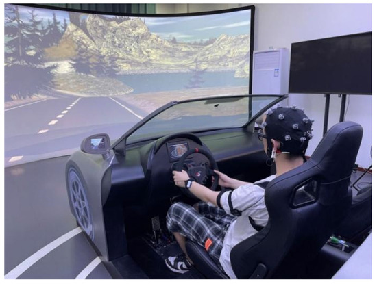 The experiment was conducted in the laboratory of Jinfa Technology Co., Ltd. The ErgoSIM intelligent cockpit human factors evaluation driving simulation system is based on the “human–vehicle–road environment” and “human-information–physical” systems theory. The ErgoSIM laboratory driving simulation scenario is shown in Figure 1. It is designed and constructed to evaluate human factors in traffic driving and intelligent cockpits. The laboratory uses the ErgoLAB human–vehicle–road environment synchronization platform as its core, enabling the real-time collection of data related to humans, vehicles, and road environments. These data were used to analyze drivers’ behaviors, cognitive load, emotional arousal, fatigue, and comfort under different environments and tasks, providing valuable information for the design and optimization of cockpit layouts, Human–Machine Interface (HMI) systems, smart system designs, and interaction methods.