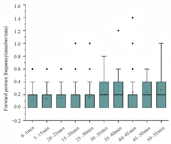 Box plot of forward posture frequency. Both median and interquartile range increase significantly from 0–5 min to 45–50 min, indicating more frequent body adjustments due to fatigue accumulation.