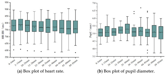 Heart rate data showed a slight decrease as the driving time lengthened. This indicates that the driving process became less novel and more monotonous, and task difficulty decreased. Figure 3a shows the box plot for heart rate. Heart rate was higher at the beginning of the driving task and gradually decreased over time. However, this decrease in heart rate could also be attributed to other factors, as studies have pointed out that heart rate can drop under stress or tension.