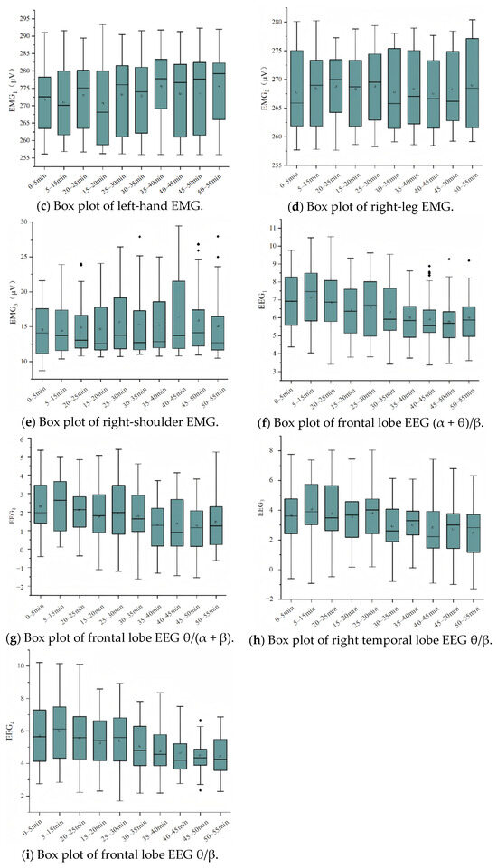 Figure 3c–e show box plots for left-hand EMG, right-leg EMG, and right-shoulder EMG. The maximum and average values of EMG signals from the left hand, right leg, and right shoulder increased as driving time progressed, indicating that muscle load increased as the driving time extended.