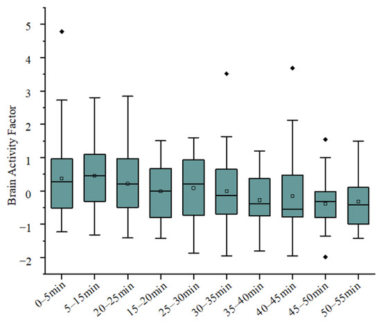 As driving time increases, Figure 5 shows that the brain activity factor gradually decreases, indicating that fatigue reduces brain excitation, which is detrimental to driving safety. Mental load interference leads to a deviation between driving behavior and actual performance. When this exceeds a certain threshold, it intensifies the impact of driving time on fatigue. Prolonged driving accumulates brain activity load, and driving efficiency rapidly declines. Appropriate rest can alleviate this fatigue after a break. The research by Russo et al. [28] has shown that fatigue is related to brain networks, especially damage to the frontal–thalamic pathway. Multiple studies included in the systematic review by Scarpelli et al. [29] indicated that there are significant differences in brain activity patterns between older drivers and younger groups, which directly affect the variation characteristics of F1 and the performance of fatigued driving. Future studies need to validate F1 across a broader age range to improve the generalizability of the model.