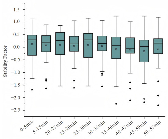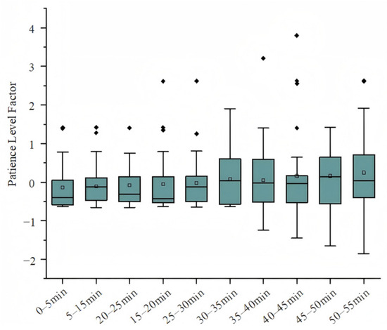 As shown in Figure 8, the distribution of the patience-level factor becomes more scattered, indicating increased variability in driver patience with fatigue. The frequency of posture changes during driving. Specifically, the patience-level factor reflects the driver’s behavioral stability under fatigue, quantified by monitoring the frequency of posture variations; an increase in posture change frequency corresponds to a decrease in patience level. This increased variability in the patience factor indicates growing uncertainty in driving behavior, which negatively impacts driving safety. Prolonged driving leads to deviations between intended actions and actual performance, but appropriate rest can help restore patience levels.