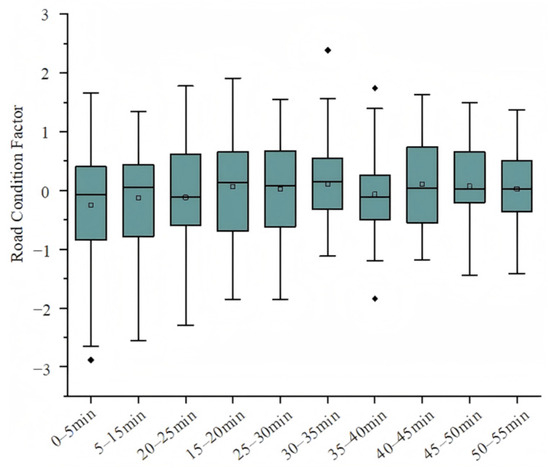 Road condition factors refer to driver behavioral responses (e.g., muscle activity, throttle usage) under different road conditions. As time progresses, the road condition factor data in Figure 7 becomes more concentrated, indicating that drivers become more familiar with road conditions and drive more stably. Driver behavioral responses (e.g., muscle activity, throttle usage) under different road conditions. However, when road conditions become particularly difficult, the road condition factor, together with the driving time factor, can significantly contribute to driving fatigue. Poor road conditions increase the challenges of driving, leading to reduced efficiency and accuracy, which accelerates fatigue. Over time, drivers’ fatigue increased significantly under poor road conditions, and their driving efficiency dropped rapidly. Improving lighting conditions can reduce the collision rate by about 30% or more [32], indicating that good lighting conditions are critical to improving driving safety.