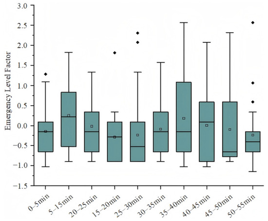 The emergency-level factor in Figure 9 fluctuates during driving, increasing in response to emergencies and decreasing during smoother driving conditions. These fluctuations grow more pronounced as fatigue sets in, suggesting that drivers become more reactive to emergencies and less attentive to routine driving tasks. Frequent emergency responses can contribute to increased fatigue. In their research, Olson et al. [33] identified 4452 safety-critical events, including collisions, near-collisions, collision-related conflicts, and unintended lane departures, as well as 19,888 baseline events. They found that, in most safety-critical events, the driver was performing tasks unrelated to driving. Additionally, the risk of driving significantly increased when performing complex tasks, and eye-tracking analysis revealed that the driver’s gaze position and attention to the road ahead were related to task execution.