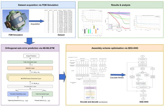 To address these challenges, this paper proposes an integrated framework that combines finite element simulation, deep learning-based surrogate modeling, and intelligent optimization. As illustrated in Figure 1, this framework consists of three main stages: first, a sample dataset containing various assembly process schemes is constructed through high-fidelity finite element simulation; second, an Attention-based Bidirectional Long Short-Term Memory (AB-BiLSTM) network is designed as a high-fidelity, millisecond-level surrogate for FEM simulations, while attention weight visualization enables interpretability by linking model focus to physical changes; finally, using the trained surrogate model as the fitness function, a Stratified Evolutionary Group-based Harris Hawks Optimizer (SEG-HHO) algorithm is proposed, which dynamically partitions the population into three groups with different tasks and introduce evolutionary operator, to perform a global search for the optimal bolt tightening sequence and preloads that minimize the orthogonal axis error.