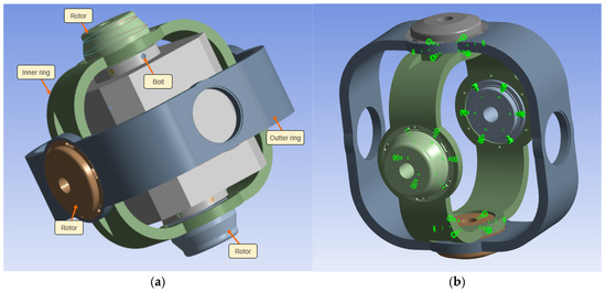 Gyroscope model in ANSYS: (a) different components of the inertial gyroscope; (b) 24 key bolts are displayed in green (highlighted by ANSYS to indicate the bolt models).