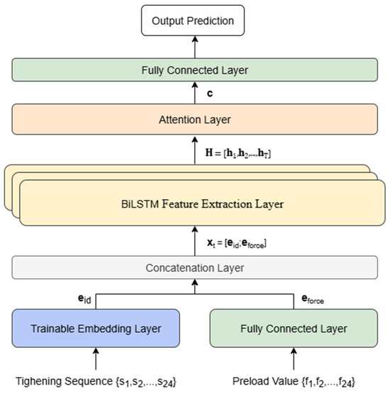 With the rise of deep learning, models designed for sequential data have gained prominence. Recurrent Neural Networks (RNN) [15] and their advanced variants like Long Short-Term Memory (LSTM) [16] and Gated Recurrent Unit (GRU) [17] have demonstrated exceptional capabilities in capturing temporal patterns. This makes them naturally suited for modeling the bolt tightening process, where each step’s outcome is conditioned on all previous steps. While a conventional Bidirectional LSTM (BiLSTM) [18] can process the sequence from both forward and backward directions to capture context, it treats all steps with uniform importance. This is a significant drawback, as not all assembly steps contribute equally to the final error. In contrast, our proposed Attention-based BiLSTM (AB-BiLSTM) enhances this architecture by introducing a temporal attention mechanism. This allows the model to dynamically assign higher weights to more influential steps—such as the final locking torque—thereby achieving a more physically meaningful representation and superior predictive accuracy compared to standard BiLSTM models that overlook this critical temporal hierarchy.
