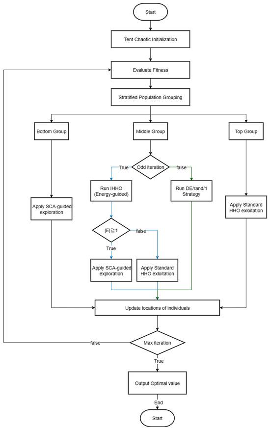 The Harris Hawks Optimization (HHO) [31] is a more recent swarm intelligence algorithm that has demonstrated excellent performance in many engineering optimization problems [32,33,34,35,36]. However, the standard HHO algorithm is not without its limitations. As noted in several studies [32,36], when applied to high-dimensional or complex multimodal problems, HHO can suffer from a decline in population diversity during the later stages of the search, leading to premature convergence to local optima. To address these shortcomings, researchers have proposed numerous HHO variants. These improvements can be broadly categorized into three groups: (1) hybridization, which combines HHO with other optimizers like GA to leverage their complementary strengths; (2) population enhancement, which introduces mechanisms like chaotic initialization or population stratification to improve diversity and exploration; and (3) operator modification, which refines the exploration or exploitation phases of HHO. Our proposed SEG-HHO falls into three categories by introducing a stratified evolutionary framework and hybrid search mechanisms, aiming for a more robust balance between exploration and exploitation.