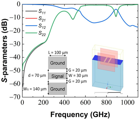 Simulated S-parameters of the standard CPW from 250 MHz to 1.1 THz. Insert: Standard CPW configuration for Ansys HFSS simulation. S21 and S12 overlaps in this graph.