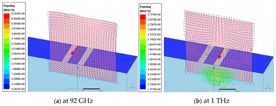 Poynting vector at (a) 92 GHz and (b) 1 THz for the standard CPW.
