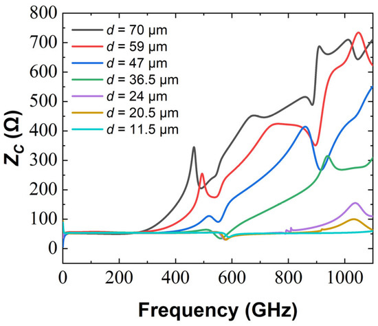Simulated characteristic impedance ZC vs. frequency for multiple CPW configurations with decreasing d.