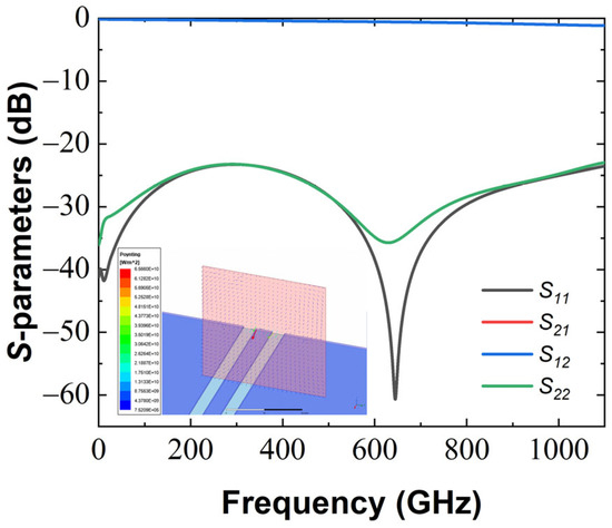 This optimized CPW shows dramatically improved transmission characteristics. S21 remains better than −1.1 dB up to 1.1 THz, and S11 remain well below −23 dB, confirming excellent impedance matching and minimal signal reflection (Figure 4). Finally, to validate that this improvement was not limited to impedance behavior alone, we analyzed the Poynting vector distribution at 1 THz for the optimized geometry. The electromagnetic energy is now fully confined around the signal conductor, and no significant leakage toward the substrate is observed (Figure 4). This confirms the suppression of unwanted modes and highlights the suitability of this design for broadband on-wafer measurements.