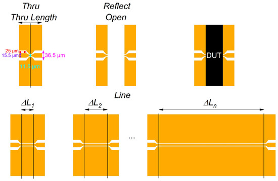 Each frequency band was supported by Line standards with increasing physical lengths: 80 µm (Thru), 120 µm, 140 µm, 160 µm, 180 µm, 200 µm, 240 µm, 300 µm, 450 µm, and 580 µm (Figure 5). This range enables sufficient phase diversity for matrix inversion during mTRL extraction, improving calibration accuracy across the 250 MHz–1.1 THz band.