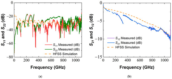 To validate the kit, we measured a 1000-µm CPW line and compared the calibrated S-parameters to full-wave HFSS simulations (Figure 6). The comparison between the simulated and measured CPW lines were conducted on a 1000 µm length, to reduce the influence of parasitic effects such as probe-to-substrate coupling (strongly affecting the measurement in the [220–325 GHz] range using an infinity probe) and the use of a sufficient propagation length allows for a more accurate analysis of the resulting S-parameters.