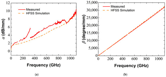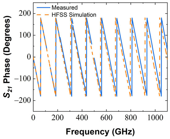 The measured S-parameters closely matches the simulation across the entire band (Figure 6), with a deviation of less than 1.5 dB for the S21 (Figure 6b). Minor ripples above 750 GHz are attributed to limited dynamic range of the frequency extenders in [750–820 GHz] and beyond 1 THz. The S21 phase shows continuous behavior with a maximum discrepancy of 30° (Figure 7), likely due to effective permittivity mismatch between simulation (εeff = 6.5) and measurement (εeff ≈ 7.3). This small error can also partially due to uncertainty of probe placement and optimized probe overtravel used on each contact after multiple probing. The propagation constant (Figure 8) remains continuous and stable, confirming the robustness of the calibration method.