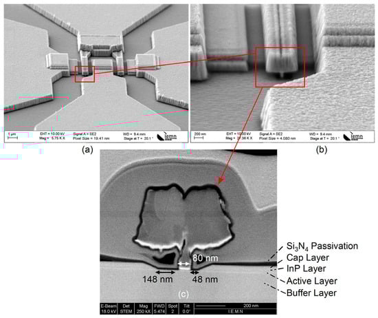 A composite channel structure combining InGaAs and an ultra-thin InAs insertion layer was employed to benefit from the high electron saturation mobility of InAs, while ensuring good lattice matching and thermal stability. The channel was separated from the Schottky gate by a thin InAlAs spacer and a dual δ-doping scheme, designed to simultaneously minimize parasitic access resistance and suppress short-channel effects. The structures were defined using electron-beam lithography, followed by Ti/Pt/Au metallization (25/25/500 nm) to ensure low contact resistance and high reproducibility at THz frequencies (Figure 9).