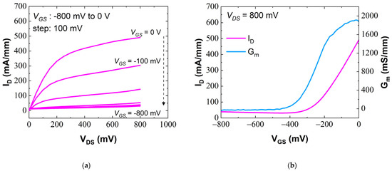 The output characteristics (Figure 10) exhibit excellent linearity and saturation behavior, with a maximum drain current density of 491 mA/mm at VGS = 0 V and VDS = 800 mV. This level of performance indicates efficient carrier injection and confirms the quality of the ohmic contacts and channel design.