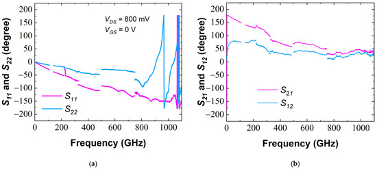 Measured phase (a) S11 and S22 and (b) S21 and S12 of InP-HEMT (LG = 80 nm, WG = 2 × 4 µm, LRS = 48 nm, and LRD = 148 nm) from 250 MHz to 1.1 THz using mTRL.