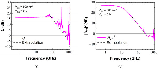 Measured and extrapolated (a) U and (b) ∣H21∣2 of InP-HEMT (LG = 80 nm, WG = 2 × 4 µm, LRS = 48 nm, and LRD = 148 nm) from 250 MHz to 1.1 THz using mTRL.