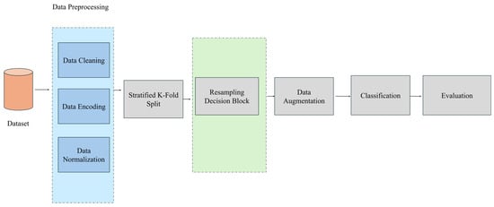 The proposed GAN-AHR methodology, which addresses class imbalance issues in IDSs, consists of multiple stages as shown in Figure 1, each of which contributes to generating high-quality synthetic samples. In the first stage, a three-step data preprocessing procedure is applied to the original data to ensure data quality and consistency. Subsequently, the processed dataset is then divided into folds using K-fold cross-validation to be later used in evaluation. The key component of the methodology is the Adaptive Resampling Decision Module, which first decides whether synthetic data are needed and then dynamically chooses between BSMOTE and the CGAN according to class compactness and data density criteria. At this stage, the data are balanced, and the classification model can be trained and tested. Finally, the predictions are evaluated using key criteria such as F1-score. The logic of the proposed algorithm is illustrated in Algorithm 1, whilst the details of every stage are described in the following subsections.