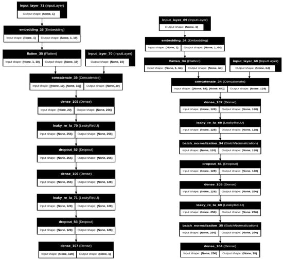 The CGAN architecture consists of two components the generator, which produces synthetic samples, and the discriminator, which verifies them. When data are qualified for CGAN generation, the generator takes two inputs a noise vector and a desired class label, where the latent dimension is set to 64. The generator’s architecture consists of several layers, namely, the fully connected, dropout, and dense layers. Additionally, the tanh activation function is adopted to ensure data normalization, [−1, 1].