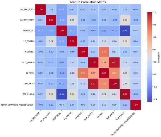 The dataset used for evaluation is the NF-UNSW-NB15 dataset [], which is derived from the original Netflow dataset. It includes ten classes: Benign, Exploits, Fuzzers, Reconnaissance, Generic, DoS, Analysis, Backdoor, Shellcode, and Worms. The class distribution is shown in Figure 4. This dataset is highly imbalanced, with the benign class constituting approximately 93% of the data. There are 12 features, as shown in Table 2, and the correlation matrix of the features is shown in Figure 5.