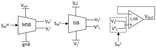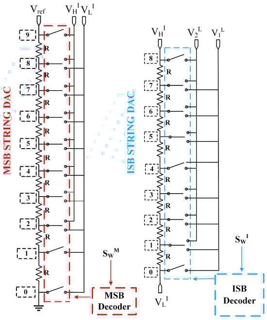 where . The ISB and LSB string DACs remain unchanged. In this structure, for each MSB code, , the high and low references of the ISB string DAC are connected to nodes, and , respectively, in the modified MSB string. A schematic of the improved structure is shown in Figure 4.
