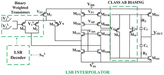 The concept of an LSB differential pair interpolator was initially introduced in [13]. However, that work did not extend the idea to an interpolator that functions as a load-driving buffer. In our design, we implement a two-stage folded cascode amplifier with a Class AB biasing stage that serves as an interpolator and buffer for DAC output. The proposed architecture includes an -bit LSB segment which produces a fine interpolation between the reference voltages and provided by the ISB stage, wherein the interpolation occurs in response to an -bit LSB subword. The LSB segment is a two-stage cascode amplifier with a Class AB output stage, in which accuracy is assured by the precise summing of differential currents. This is accomplished by one of the amplifier’s PMOS input pairs being implemented as a binary-weighted transistor structure. The gates of the transistors within this structure are selectively connected to either or by switches, respectively, in response to the decoding of the -bit LSB subword. For an -bit LSB subword, the decoder is arranged so that each increment in the value of the subword switches the gate connection of a corresponding portion of the binary-weighted transistor structure, altering the effective transconductance of the differential pair. The output of the differential input pair drives the folded cascode stage, which provides high gain. The output of this first stage is then connected to a second stage, which includes the Class AB output buffer. The gate biases for the Class AB stage are provided by a Monticelli biasing circuit, which ensures stable rail-to-rail output performance. The amplifier’s input pair, implemented as a binary-weighted transistor structure, generates a differential signal current. This current is then processed by the folded cascode stage, and subsequently buffered by the Class AB stage to produce the final output voltage. This integrated design serves the dual purpose of being both an interpolator and the final output buffer. This integrated architecture eliminates the need for a separate buffer, reduces static loading on the ISB string, provides the necessary input common-mode range, and ensures rail-to-rail output performance to meet load requirements. The power consumption of the operational amplifier is 630 µW. Figure 2 provides a detailed circuit diagram of the proposed LSB interpolator for an implementation where bits.