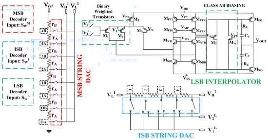 The proposed architecture consists of three stages, an -bit MSB, an -bit ISB resistor string ladder, and an -bit LSB differential pair interpolator, forming an n-bit resolution DAC. The digital input codes, , , and , are used to control switches in the MSB ladder, ISB ladder, and the LSB differential interpolator, respectively. A specific decoding scheme, similar to that presented in [25], is employed. Lower-order bits are handled by the ISB resistor ladder and the LSB differential interpolator. Under ideal conditions, without resistor mismatch or switch non-idealities, the combination of the ISB and LSB stages has been shown to yield a linear ()-bit output by providing unique node voltages from the ISB string. The respective stages are discussed below.