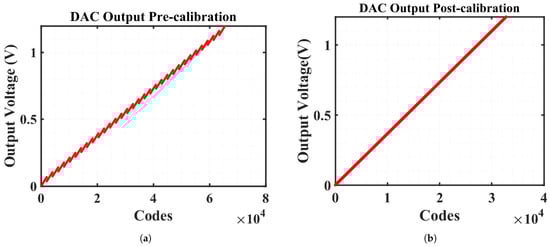 (a) Pre-calibration DAC transfer curve for DAC structure 1. (b) Post-calibration DAC transfer curve for DAC structure 1.